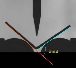 Measurement of the break angle online during the disc-bending-test according to VDA 238-100. Optical recording of angle parallel to force-way-measurement.
